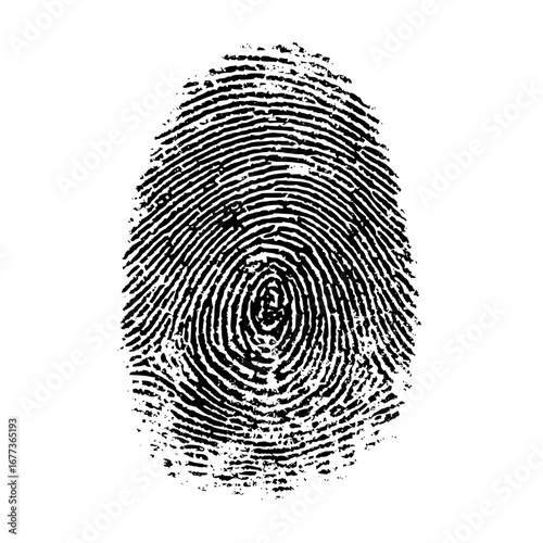 A detailed black and white fingerprint image showing the unique pattern of ridges and valleys of a human finger