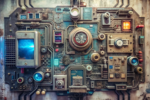 A detailed circuit board with various components, including lights and screens, showcasing a blend of technology and design.