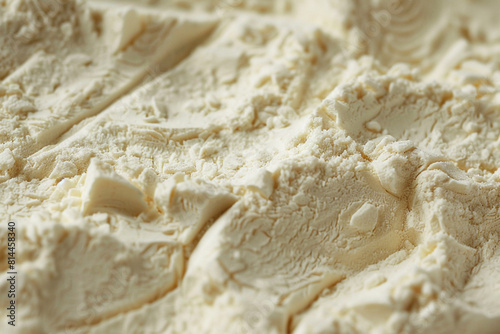 A detailed closeup image showcasing a whey protein powder, emphasizing the texture and color of the supplement, typically used for muscle recovery and growth