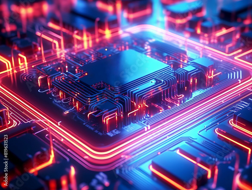 A detailed closeup of a circuit board with glowing neon lines on a dark blue background, representing technology concept. Generative AI