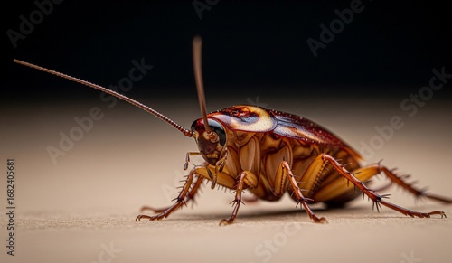 A detailed close-up of a cockroach (Blattodea) on a neutral surface