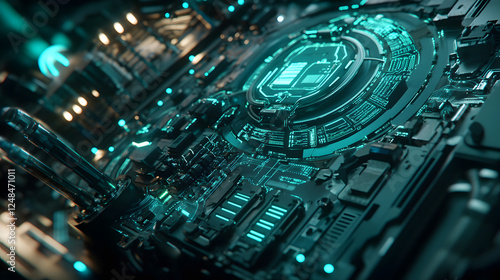 A detailed close-up of a digital circuit with bright blue and orange lights, symbolizing advanced technology.