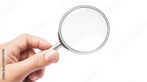 A detailed close-up of a hand holding a magnifying glass against a bright white background for clarity and focus on objects.