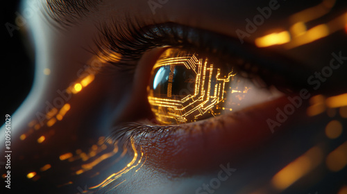 A detailed close-up of a human eye seamlessly integrated with microcircuitry, glowing softly in golden hues, surrounded by realistic skin textures
