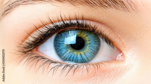 A detailed close-up of a human eye showcasing vibrant blue iris and long eyelashes.