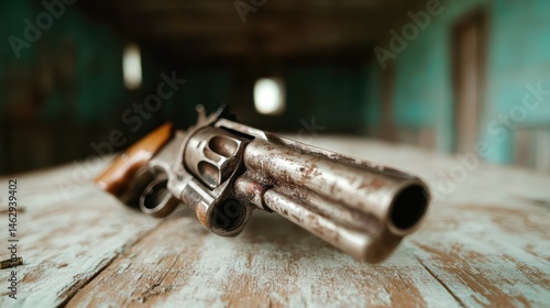 A detailed close-up of a vintage revolver rests on a rustic, weathered wooden surface, showcasing its age and character, evoking feelings of nostalgia and adventure.