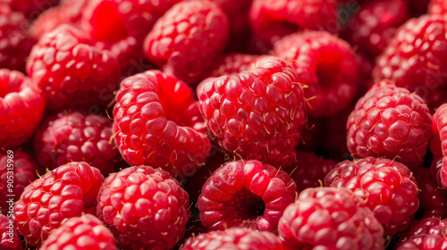 A detailed close-up of fresh red ripe raspberries, with each berry looking plump and juicy. The background is densely packed with raspberries, highlighting their freshness and appeal.