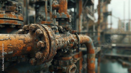 A detailed close-up of rusted, weathered industrial pipes, showcasing corrosion and decay in an abandoned factory environment. Perfect for projects depicting industrial decline. AI generated.