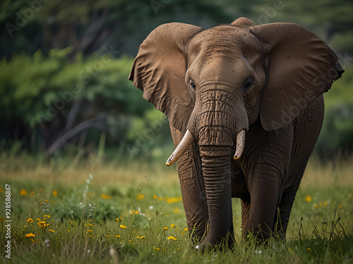 a detailed close-up shot of an elephant standing amidst the green savanna