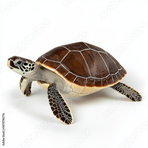 A detailed close-up studio shot reveals a meticulously crafted model of a hawksbill sea turtle showcasing its intricate pattern and lifelike features against a stark white