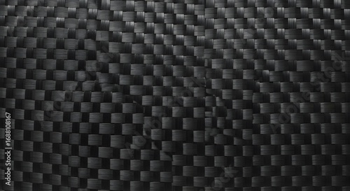 A detailed close-up view of a black carbon fiber composite material, showcasing its strong, interwoven checkerboard texture and pattern.
