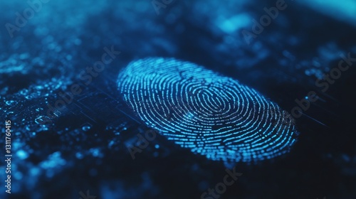 A detailed close-up view of a glowing biometric fingerprint pattern on a digital surface. The futuristic blue tones convey themes of security, identity verification, and modern technology.. AI