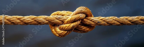 A detailed close-up view of a tightly knotted gold-colored rope set against a soft, blurred blue background, illustrating concepts of strength and connection.