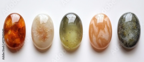 A detailed close-up view of four oval-shaped stones arranged in a row, showcasing their unique textures and natural colors.
