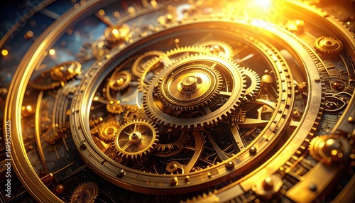 A detailed close-up view of intricate gears and machinery, showcasing a golden, complex clockwork mechanism with a radiant, warm light source.