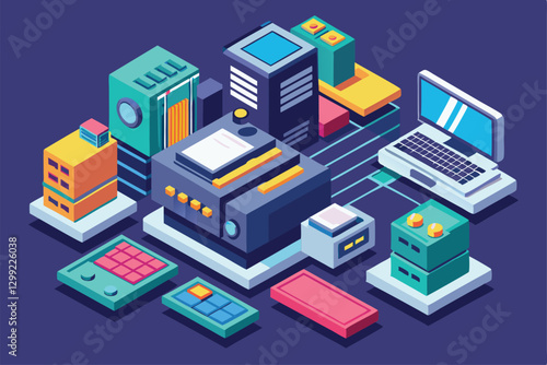 A detailed depiction of a dynamic operating system setup featuring various computing devices and components, Operating system Customizable Isometric Illustration
