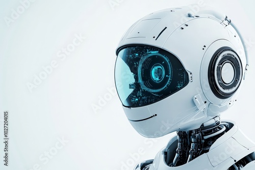 A detailed depiction of a futuristic robotic head with sleek, white surfaces and glowing digital circuits, representing advanced technology and AI innovation.
