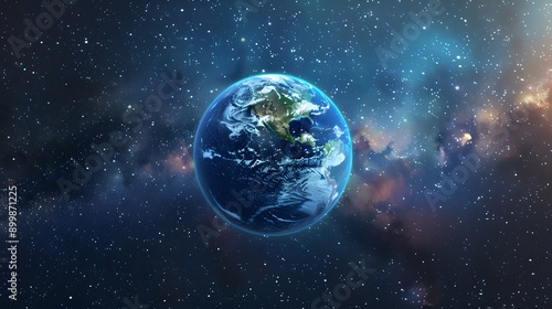 A detailed depiction of Earth floating in the vacuum of space with colorful nebulae