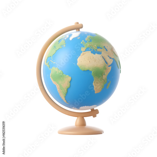 A detailed educational globe showing continents and oceans mounted on a wooden stand isolated on transparent background