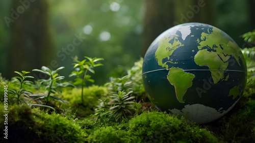 A detailed globe rests on vibrant green foliage in a serene forest setting. Globe Amidst Lush Greenery in Forest