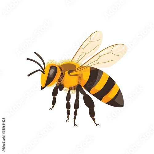 A detailed illustration of a honeybee in flight against a plain white background perfect for educational purposes or design projects.