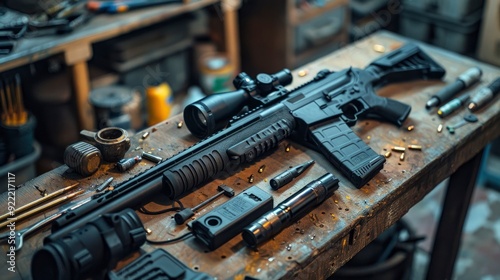 A detailed image of a tactical shotgun with attachments like a flashlight and laser sight, laid out on a workbench with tools and maintenance supplies