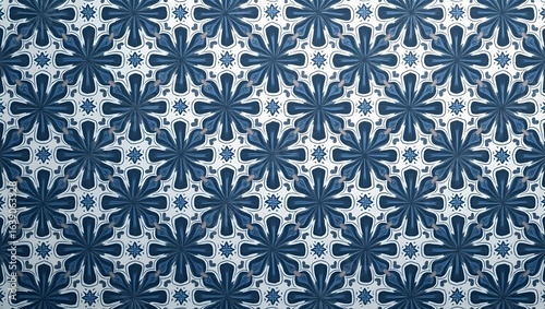 A detailed mockup of a high-resolution, intricate blue and white geometric floral pattern, ideal for textile or ceramic surface design.