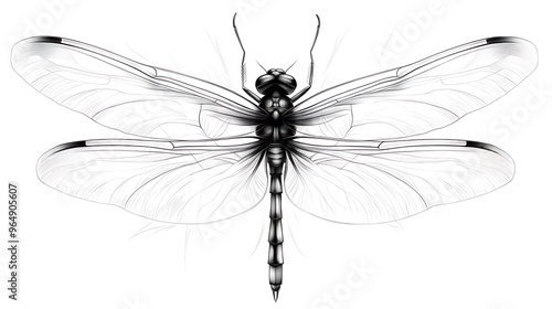 A detailed pencil sketch of a dragonfly with outstretched wings, isolated on a white background.