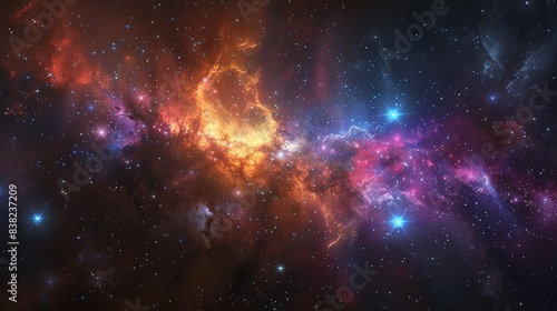 A detailed rendering of a molecular cloud, with dense, dark regions where new stars are forming, illuminated by the light of nearby stars and interspersed with colorful gas emissions. shiny, Minimal
