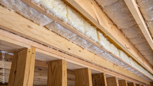 A detailed shot focusing on the edges of the fiberglass insulation where it meets the rough lumber of the studs. The insulation appears slightly compressed at the joints
