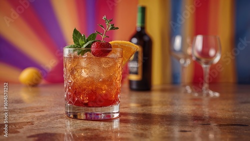 A detailed shot of a lively, freshly made cocktail set against a bright, multicolored backdrop