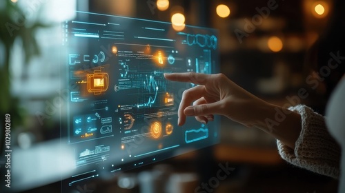 A detailed shot of an AI-enabled smart assistant display responding to a spoken command, with a person's hand gesturing nearby.