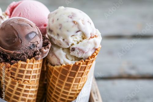 A detailed shot of multiple ice cream cones with different pastel-colored scoops, highlighting the textures and flavors of a tempting selection of frozen summer desserts.