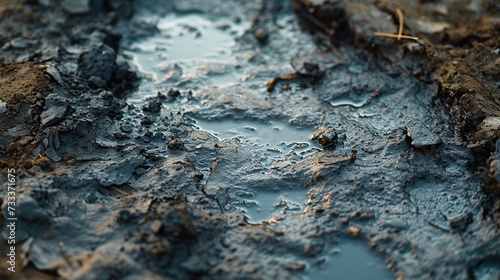 A detailed shot of wet, muddy ground with small puddles of water, reflecting environmental conditions in natural habitats.