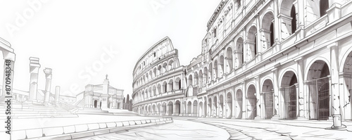 A detailed sketch of a classic Roman amphitheater, with carefully rendered arches and columns on a clean white background. The sketch highlights the grandeur and symmetry of ancient architecture.