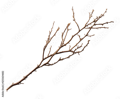 A detailed view of a bare branch with budding leaves, showcasing the patterns of nature. Isolated on transparent white background, png