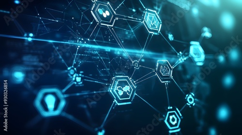 A detailed view of a blockchain network visualized as a series of interconnected digital nodes and medical icons, set against a backdrop of a modern clinic with bright, neutral lighting, innovative