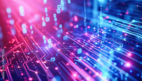 A detailed view of a circuit board can be seen with vibrant blue and red lights illuminating it