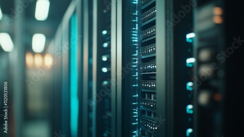 A detailed view of a circuit board featuring intricate components, brightly lit with blue and white LEDs, enhancing a modern tech ambiance