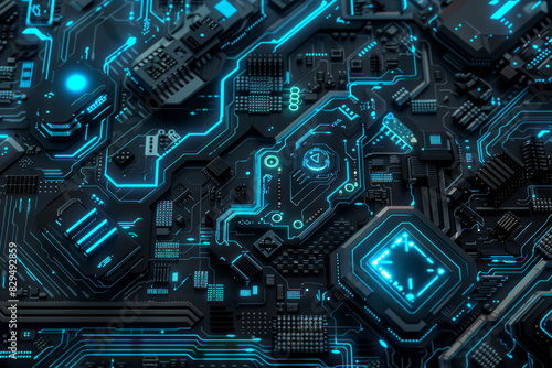 A detailed view of a circuit board with clean lines and glowing blue accents.