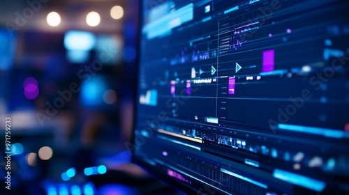 A detailed view of a computer screen featuring a vibrant editing timeline, illuminated by ambient blue and purple lighting in a creative workspace setting