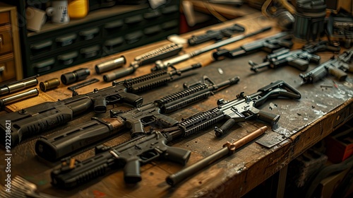 A detailed view of a gun cleaning process with various tools laid out on a workbench, highlighting the meticulous care required for firearm maintenance