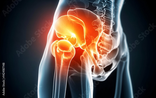 A detailed view of a human hip joint, illustrating anatomy and highlighting inflammation in a medical context.