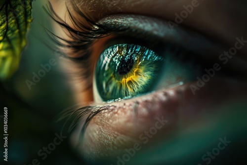 A detailed view of a person's green eye with eyelashes and eyebrow visible