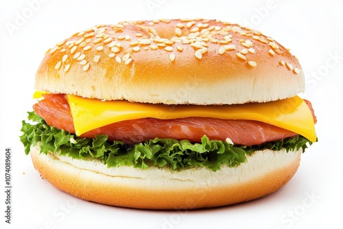 A detailed view of a sesame bagel with smoked salmon cream cheese and cheddar on a light backdrop