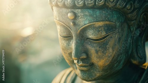 A detailed view of a spiritual statue representing wisdom and enlightenment, framed by gentle light.