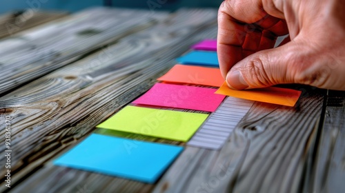 A detailed view of a teacher's hand applying adhesive stickers to graded papers, set against a background of notes and office materials, highlighting the organization in an educational setting.