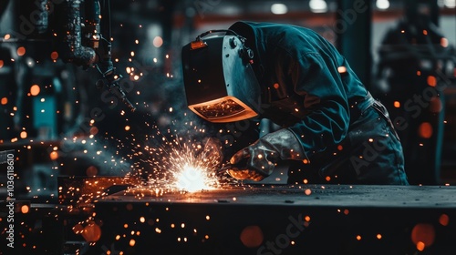 A detailed view of a welder in protective gear creating sparks while welding metal parts, Metal workshop scene, Dynamic and intense style