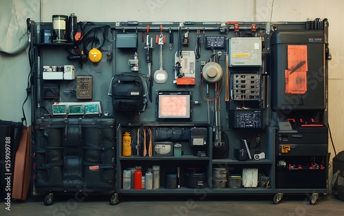 A detailed view of a well-organized tool wall, showcasing a variety of equipment and tools, perfect for professionals and DIY enthusiasts in industrial settings.