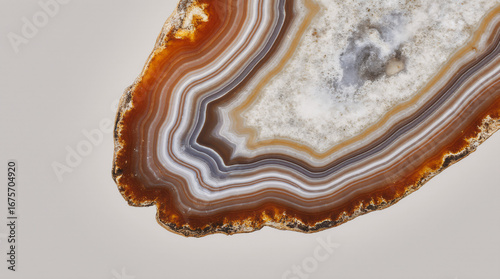 A detailed view of an agate slice displays its unique, colorful bands on a pale gray background, emphasizing texture and pattern